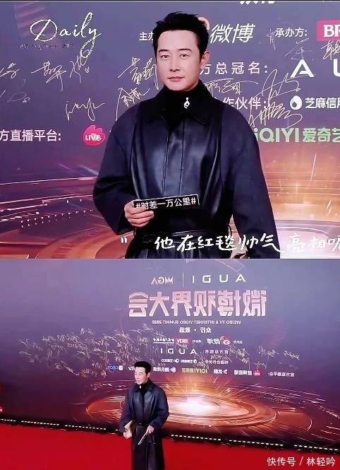 他选择了一件设计感十足的黑色皮质拼接外套,原本是想展现成熟硬朗的风格,可惜面部浮肿明显,双颊微鼓,整体看起来有些无精打采,像是连轴工作后尚未恢复元气。